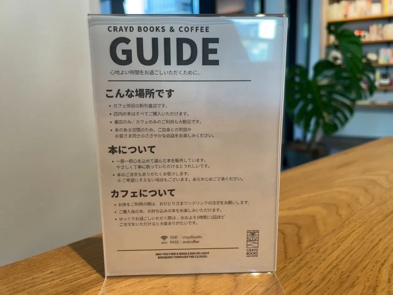 本はすべて新刊、購入可能とのことです。カフェのみ、書店のみの利用も可能で、「心地よい時間を過ごしてもらうために」というコンセプトでお店のガイドが丁寧に記載されています。