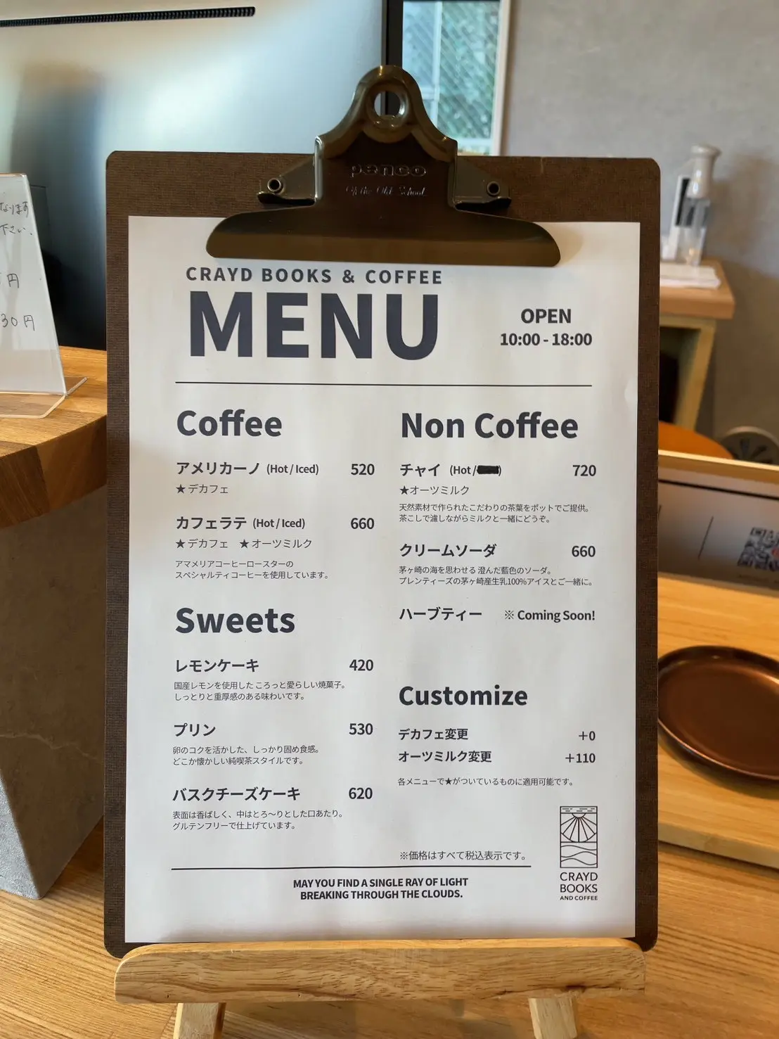 メニューはコーヒー、スイーツのほかに、チャイ、クリームソーダ、ハーブティーもあります。価格は420円~720円となっています。