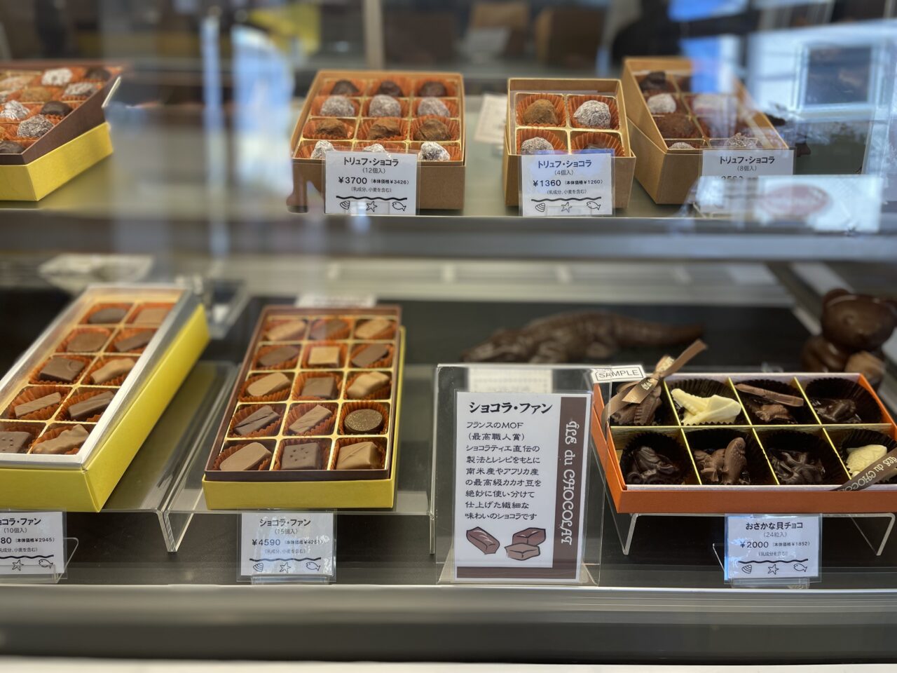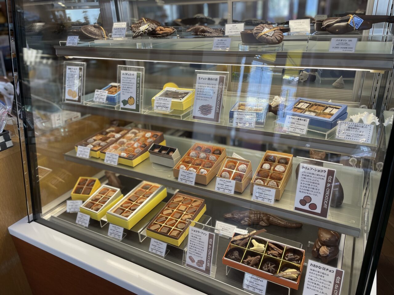 見た目がかわいい「おさかな貝チョコ(24個入)」は湘南らしいモチーフが印象的です。ほかにも「生チョコ『湘南の海』」など、店名や土地の雰囲気を感じる商品も並んでいます。
