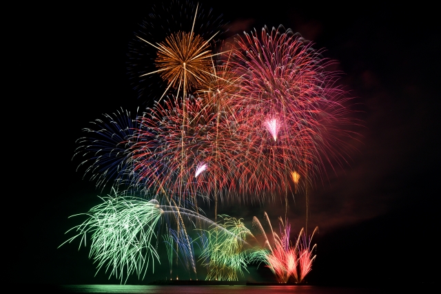 この大会最大の特徴は、海ならではの演出です。海面から扇状に広がる花火は、まるで孔雀が羽を広げたような幻想的な光景を作り出します。